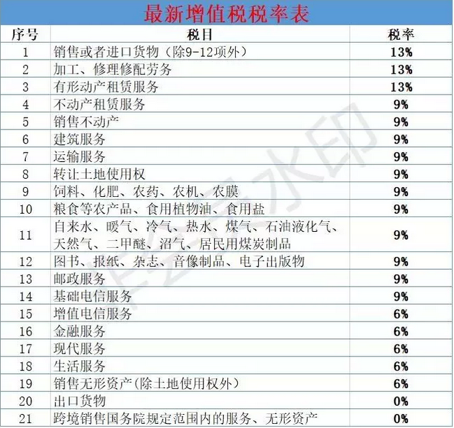 3、 銷售方想特意等到稅改確定后才開發(fā)票,怎么處理? 這要看自己議價能力,我們可以推遲付款,銷售方也會考慮資金問題 。 4、增值稅稅負降了,利潤相應(yīng)增加了,對企業(yè)真的有影響嗎? 增值稅是價外稅,不影響利潤,影響現(xiàn)金流。 5、稅改前簽的合同,等到稅改后去開票就是按9%嗎? 要看合同執(zhí)行時間,如果是稅改之后執(zhí)行的,且合同當(dāng)時也是按9%簽的合同,可以開9%的發(fā)票。 6、想問對于購銷雙方都有什么影響?建筑的總包合同呢? 對購銷雙方都有利,對制造業(yè)等少付3個點的增值稅稅額。老項目沒有影響,按簡易計稅,新項目,長期合同,應(yīng)考慮是補簽協(xié)議,作為增值稅率變更,合同金額減少3個點。 附2019年最新增值稅稅率表 按改革后的新稅率將《增值稅稅率、征收率、預(yù)征率表》進行了調(diào)整。 一稅率 增值稅稅率一共有4檔:13%,9%,6%,0%。銷售交通運輸服務(wù)、郵政、基礎(chǔ)電信、建筑、不動產(chǎn)租賃服務(wù),銷售不動產(chǎn),轉(zhuǎn)讓土地使用權(quán)以及銷售或進口正列舉的農(nóng)產(chǎn)品等貨物(易混項見附件1)稅率為9%;加工修理修配勞務(wù)、有形動產(chǎn)租賃服務(wù)和進口稅率為13%;銷售無形資產(chǎn)(除土地使用權(quán) )為6%,出口貨物稅率為0;2、其余的:貨物是13%,服務(wù)是6%。 二征收率 一共有2檔,3%和5%,一般是3%,除了財政部和國家稅務(wù)總局另有規(guī)定的。1、5%:主要有銷售不動產(chǎn),不動產(chǎn)租賃,轉(zhuǎn)讓土地使用權(quán),提供勞務(wù)派遣服務(wù)、安全保護服務(wù)選擇差額納稅的。貨物銷售里沒有5%征收率的。2、征收率絕大多數(shù)是3%,容易與5%記混的單獨記憶一下:建筑服務(wù),有形動產(chǎn)租賃,小規(guī)模納稅人提供勞務(wù)派遣服務(wù)、安全保護服務(wù)未選擇差額納稅的。3、兩個減按:個人出租住房,按照5%的征收率減按1.5%計算應(yīng)納稅額。銷售自己使用過的固定資產(chǎn)、舊貨,按照3%征收率減按2%征收。4、小規(guī)模納稅人以及選擇簡易計稅的一般納稅人(見附件2)計算稅款時使用征收率。