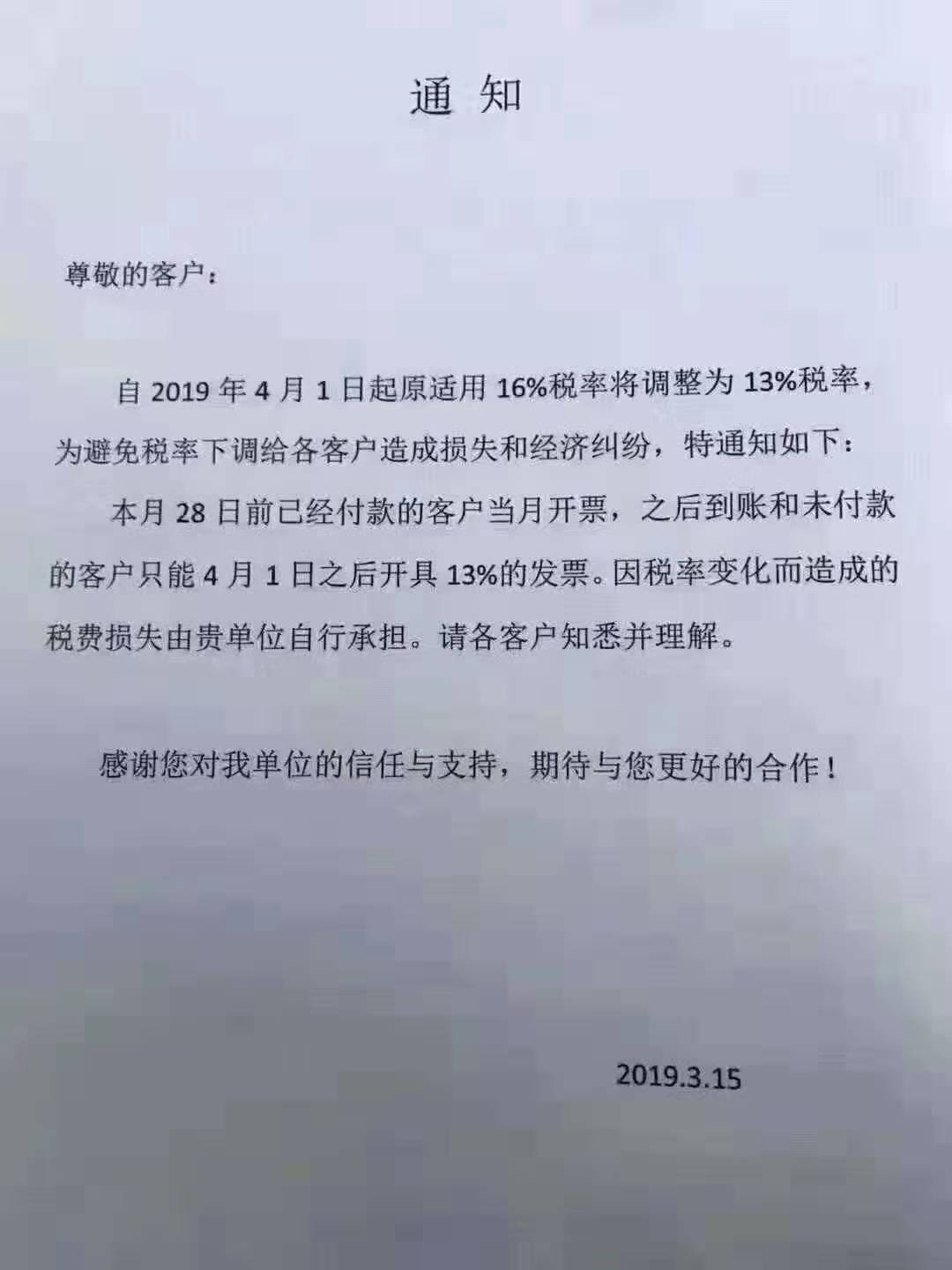 湖北程力公司財務(wù)重要通知:本月20號以后暫停開票,增值稅稅率,四月起將由16%改成13%。請:之前與我司有合同16%稅率發(fā)票的客戶,將款項轉(zhuǎn)入我公司賬戶,以便我司近期將16%發(fā)票開給您。 合同簽約未付款或只付了預(yù)付款的,發(fā)票稅率自動改成13%,我司不承擔(dān)差價!減稅為國家惠民政策,企業(yè)進、銷項及納稅率皆下調(diào),并沒有產(chǎn)品降價的說法。請大家理性認知國策、多多體諒企業(yè)供應(yīng)商。 |