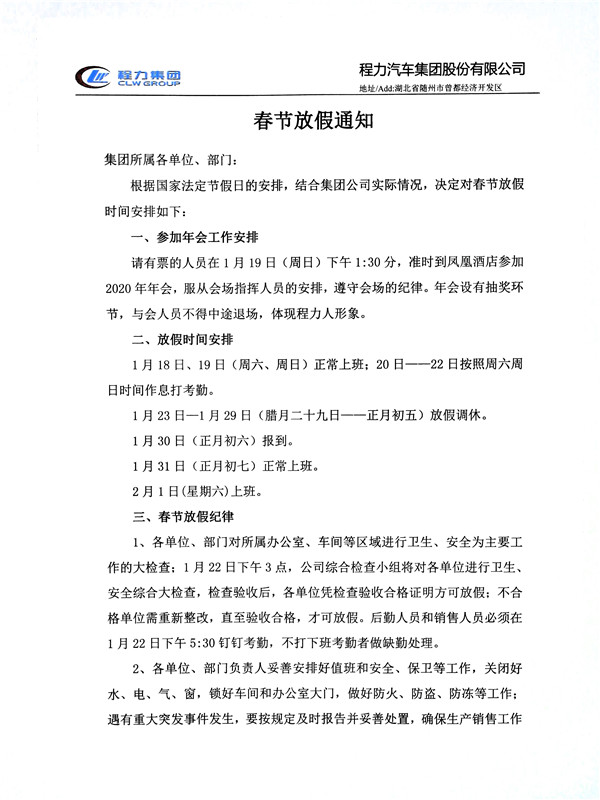 導讀:2020年喜迎新春佳節,湖北程力集團專用汽車有限公司春節工作安排:請持票人員在1月19日(星期日)下午1:30準時到鳳凰酒店參加2020年度年會,要求參會人員統一著…