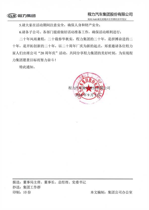 關(guān)于程力集團(tuán)二十周年廠慶的通知 尊敬的程力家人們: 時光荏苒,歲月如梭。在這個秋高氣爽,充滿希望與收獲的季節(jié)里,程力集團(tuán)即將迎來二十周年廠慶,為了慶祝這一具有重大意義的時刻,集團(tuán)公司決定舉辦一系列豐富多彩的慶典活動,活動詳情如下: 一、活動時間 9月15日(全天),8:30-23:58。 二、活動地點(diǎn) 曾都經(jīng)濟(jì)開發(fā)區(qū)程力集團(tuán)(新廠)程力大舞臺 ![]() 三、活動內(nèi)容 1.舉辦盛大的慶祝儀式,回顧程力集團(tuán)二十年的發(fā)展歷程,表彰為集團(tuán)發(fā)展做出突出貢獻(xiàn)的員工; 2.開展新LOGO、廠歌發(fā)布,展示程力集團(tuán)的新品牌和企業(yè)文化; 3.邀請專家學(xué)者舉辦專用汽車專題報告和新能源、應(yīng)急裝備、國際貿(mào)易分論壇,探討專用汽車行業(yè)的發(fā)展趨勢和未來前景; 4.組織員工文藝匯演,展現(xiàn)程力人的風(fēng)采和精神風(fēng)貌。 四、注意事項(xiàng) 1.憑票入場; 2.參會人員上午統(tǒng)一著20周年藍(lán)色T恤衫入場,參加晚會的,統(tǒng)一著20 周年紀(jì)念版白色T恤衫入場參與晚會互動; 3.參加活動的人員請遵守活動現(xiàn)場的秩序,聽從工作人員的安排,遵守會場的紀(jì)律; 4.參會人員不得中途退場; 5.請大家在活動期間注意安全,確保人身和財產(chǎn)安全; 6.請各子公司、各部門提前做好活動準(zhǔn)備工作,確保活動順利進(jìn)行; 二十年風(fēng)雨兼程,二十載春華秋實(shí),程力集團(tuán)的二十年,是拼搏奮進(jìn)的二十年,是開拓創(chuàng)新的二十年,以二十周年廠慶為新的起點(diǎn),鄭重邀請各位程力家人們出席公司“20周年慶”活動,共同分享程力集團(tuán)的美好時刻,為實(shí)現(xiàn)程力集團(tuán)愿景目標(biāo)而努力奮斗! 特此通知。 ![]() ![]() |
