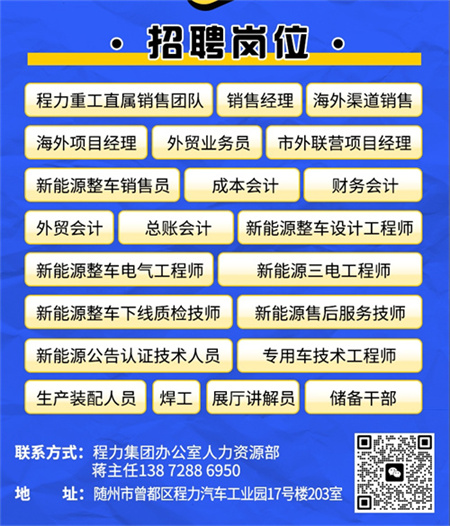 程力汽車(chē)集團(tuán)2025年近期正在招聘多個(gè)職位,包括但不限于銷(xiāo)售、技工、工程師,新能源車(chē)型技術(shù)人員和海外銷(xiāo)售人員等。以下是一些具體的招聘信息: