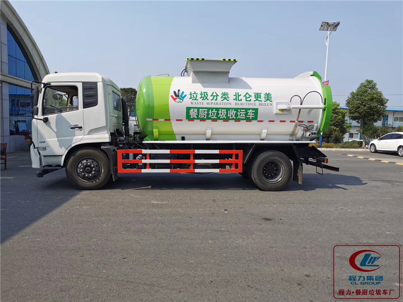 12立方東風天錦餐廚垃圾車配置:手動和電動兩種操作方式,揚州中梅多路換向閥,合肥長源液壓油泵,國內知名液壓油缸,翻轉機構配備240L垃圾桶,后蓋開啟排料方式和罐體舉升排料方式。餐廚垃圾車裝載由垃圾桶提升系統完成,該系統具有垃圾桶鎖止結構,裝卸安全可靠。垃圾桶與垃圾投入口銜接好,保證裝卸過程中餐廚垃圾不溢撒、不遺漏。 液壓系統由泵、液壓閥和順序閥以及各種功能的液壓油缸、高低壓管路組成。關鍵部件可選用原裝進口,保證產品工作可靠、安全。承載餐廚泔水容積為圓形罐體,工作時通過提升機將餐廚垃圾桶提升至罐體投料口;將桶內垃圾倒進罐體內,待罐體內部垃圾積攢滿后,將車輛開至處理廠;通過車體外部手動操作或駕駛室內部電控旋鈕操作系統開區液壓后蓋,泄出罐體內部的混合垃圾,待罐體內部無固液垃圾流出后;操作罐體舉升功能將殘余垃圾泄出。為防止污染環境和遺留異味,每日工作完成后應用清水將罐體內部清洗干凈。