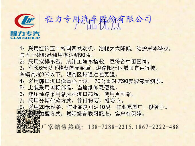 程力公司程力威牌云梯搬家車作業(yè)高度可達(dá)28米,相當(dāng)于10層樓高,云梯車的承載貨物重量每次可達(dá)300公斤,藍(lán)色牌照,C證駕駛室,無需特種操作證。非營運(yùn)車輛,使用期限30年。云梯從韓國進(jìn)口,底盤有東風(fēng)雙排座和江鈴雙排座兩種供用戶選購。廠家銷售熱線:0722-3220988.0722-7029866 |