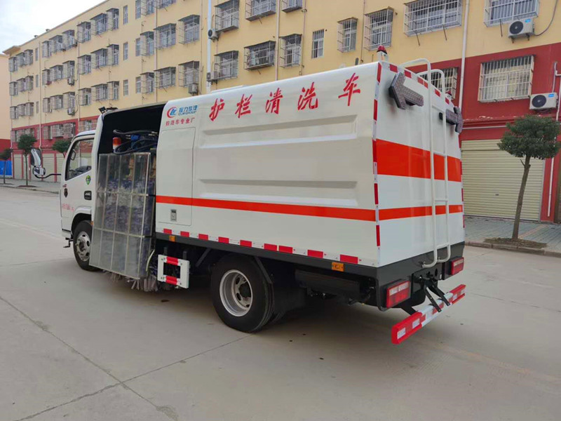 湖北程力國六東風多利卡城市護欄清洗車主要組成部分 電 氣 系 統 | 組 成 | 由底盤車電路和副發動機電氣部分及專用工作裝置操作控制電路組成。 | 底盤車系統電壓 | 12 V | 工作裝置系統電壓 | 12 V | 清 洗 裝 置 | 型式 | 在正副駕駛室后車架一側對稱布置4個清洗刷,由液壓馬達驅動,刷子升出后內外可液壓自動調節。 | 清洗刷直徑 | cm | φ50 | 清洗刷馬達轉速 | r/min | 300 | 單個清洗刷數量 | 55 | 清洗高度cm | 140-160 | 清洗原理 | 采用兩沖、四刷的清洗工藝,兩面同時清洗,使清洗更加徹底。清洗過程:首先刷輥前面的兩排噴水管噴出水將護欄充分預濕,車體前移的過程中,中間的兩排刷輥對護欄依次進行刷洗,最后由刷輥后面的兩排噴水管噴出水將殘留的灰塵沖去 |